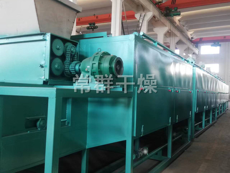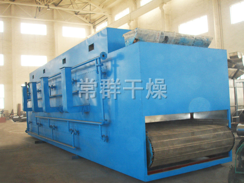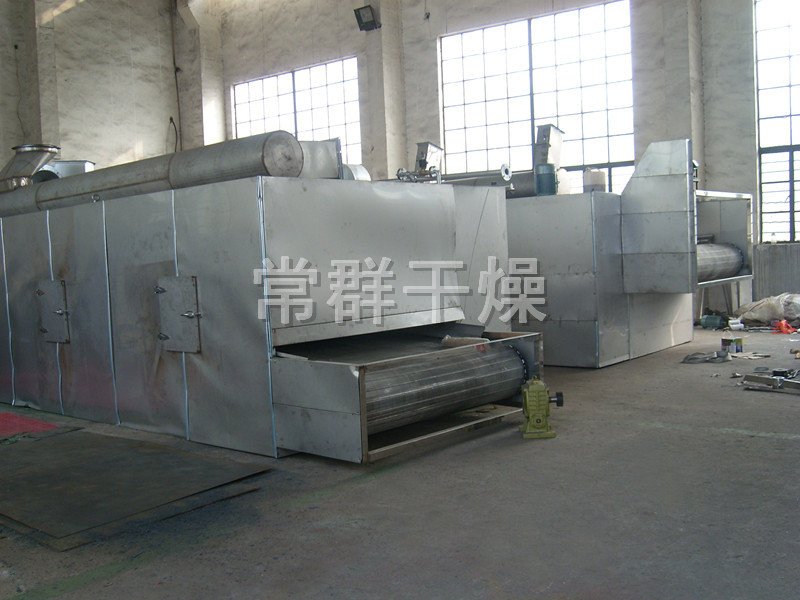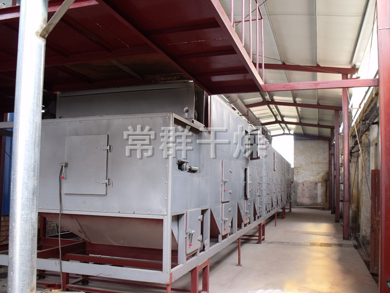 物料由加料器均勻地鋪在網(wǎng)帶上,網(wǎng)帶一般采用12-60目不銹鋼絲網(wǎng),由傳動裝置拖動在干燥機內(nèi)移動。干燥機由若干單元組成,每一單元熱風獨立循環(huán),部分尾氣由專門排濕風機排出,廢氣由調(diào)節(jié)閥控制,熱氣由下往上或由上往下穿過鋪滿物料的網(wǎng)帶完成熱量與質(zhì)量傳遞的進程,帶走物料水份。網(wǎng)帶緩慢移動,運行速度可根據(jù)物料溫度自由調(diào)節(jié),干燥后的成品連續(xù)落入收料器中。上下循環(huán)單元根據(jù)用戶需要可靈活配備,單元數(shù)量亦可根據(jù)需要選取。