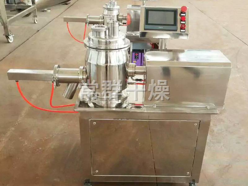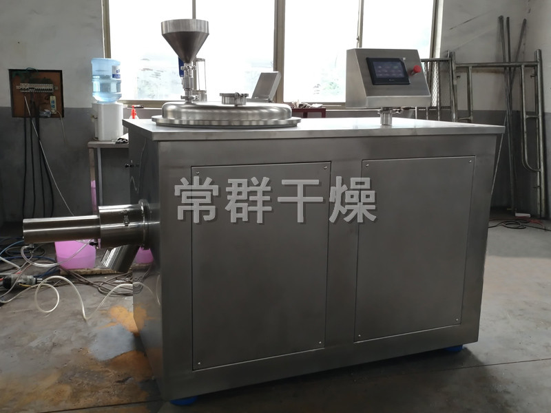 粉體物料與粘合劑在圓筒形容器中由底部混合漿充分混合成濕潤(rùn)軟材,然后由側(cè)置的高速粉碎槳切割成均勻的濕顆粒。