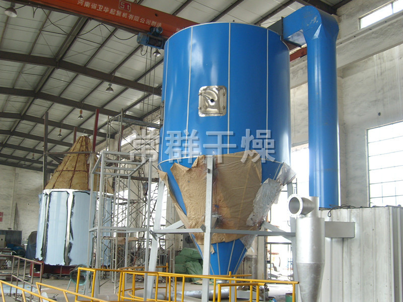 空氣經過濾和加熱,進入干燥器頂部空氣分配器,熱空氣呈螺旋狀均勻地進入干燥室。料液經塔體頂部的高速離心霧化器,(旋轉)噴霧成極細微的霧狀液珠,與熱空氣并流接觸在極短的時間內可干燥為成品。成品連續地由干燥塔底部和旋風分離器中輸出,廢氣由風機排空。